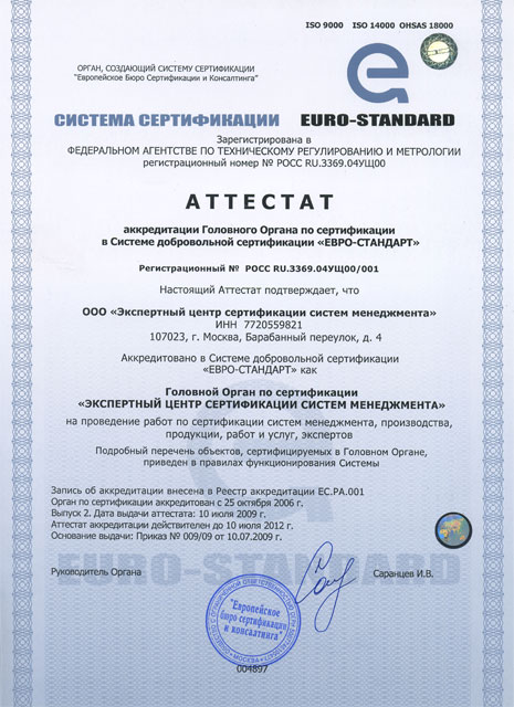Аккредитованный Головной орган по сертификации в СДС Евро-СтандартЭкспертный центр сертификации систем менеджмента официально аккредитован, как Головной орган по сертификации в СДС «Евро-Стандарт» (свидетельство об аккредитации № РОСС.RU.3369.04УЩ00/001).